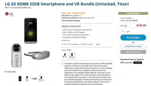 B&H offering unlocked LG G5 bundle with 360 Cam, and VR headset for $750 (a $300 savings)